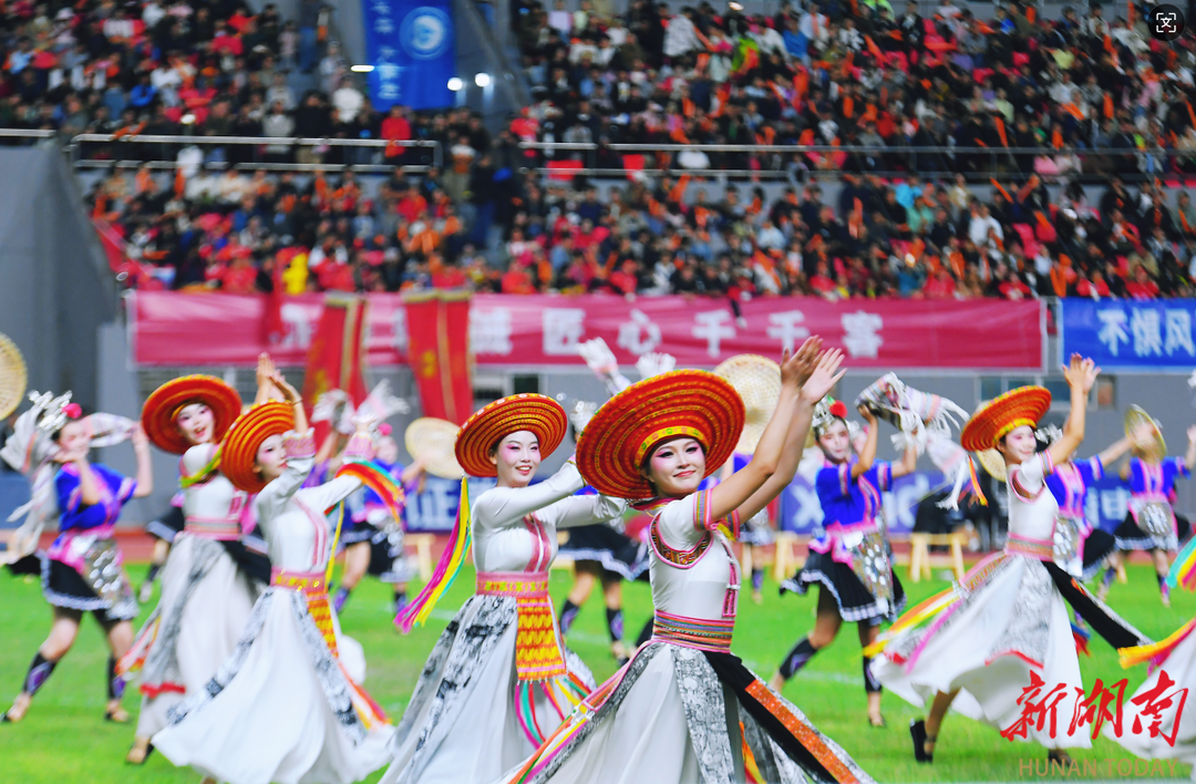 2025年10月18日晚,2025湘超联赛第六轮比赛,怀化队(红)坐镇主场迎战永州队(蓝)。开赛前,身着民族盛装的演员们献上了精彩绝伦的舞蹈表演。 湖南日报全媒体记者 徐行 摄